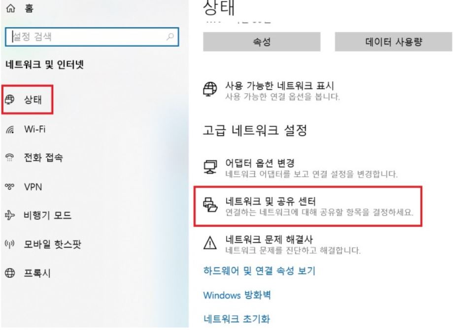 2. 상태 - 네트워크 및 공유센터 클릭 (네트워크 및 인터넷 내 왼쪽)