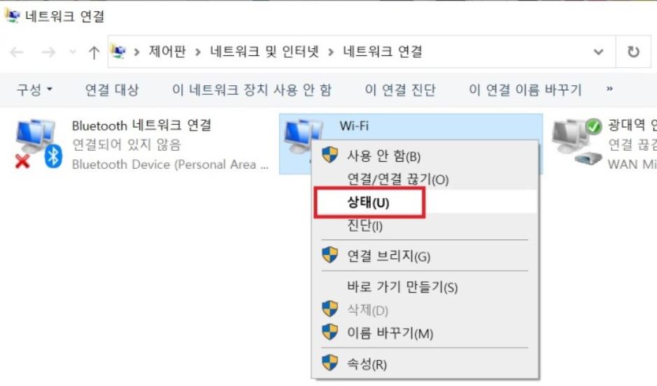 4. 네트워크 연결 창에서 [현재 사용 중인 Wi-Fi 에 마우스 오른쪽 클릭 후 '상태' 클릭]