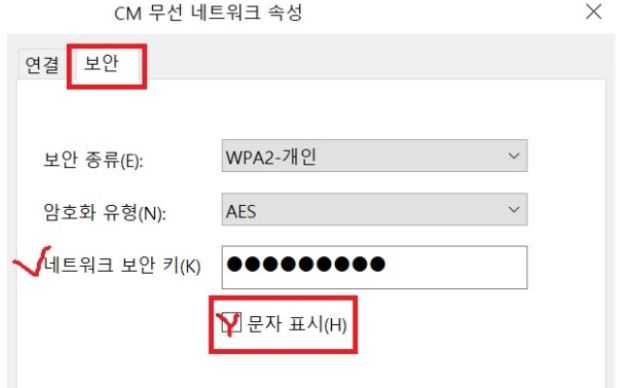 6. 무선 속성 클릭 후 팝업 창이 나오면 상단 탭에서 [보안] 선택 / 네트워크 보안 키 아래 [문자 표시] 를 체크하면 비밀번호가 나타납니다.