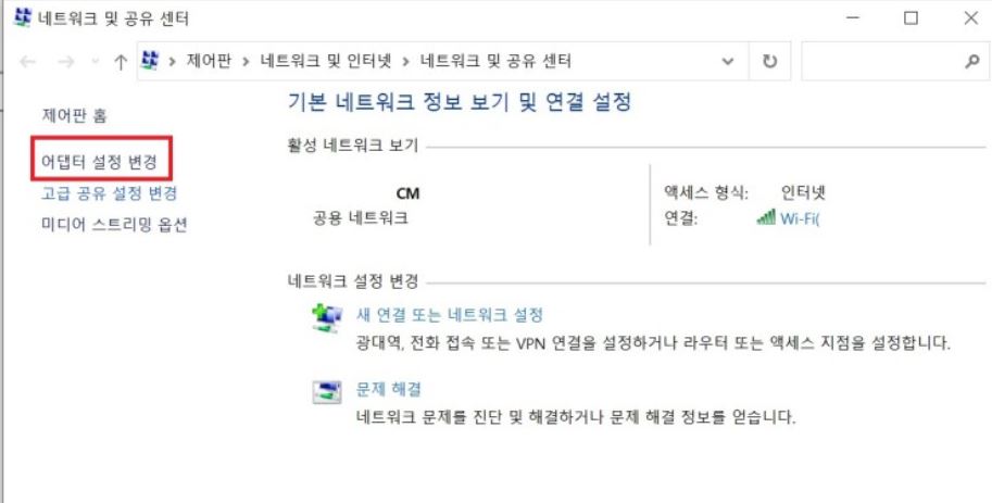 3. 네트워크 및 공유센터 창이 열린 후, 왼쪽 [어댑터 설정 변경] 클릭